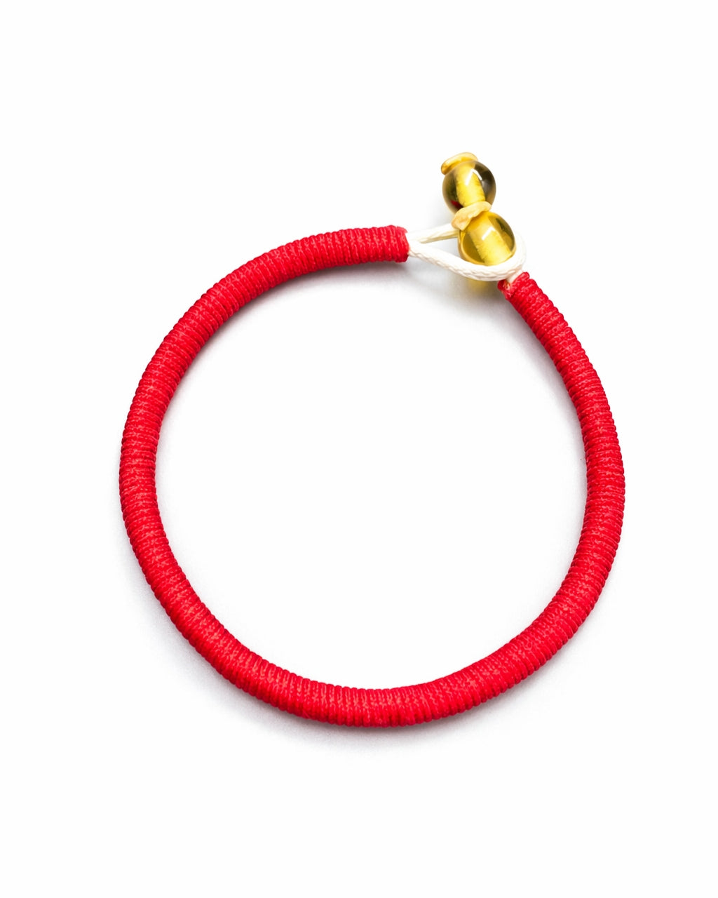 Pulsera artesanal elaborada en hilo rojo, con base interna de hilo blanco que aporta resistencia y durabilidad.